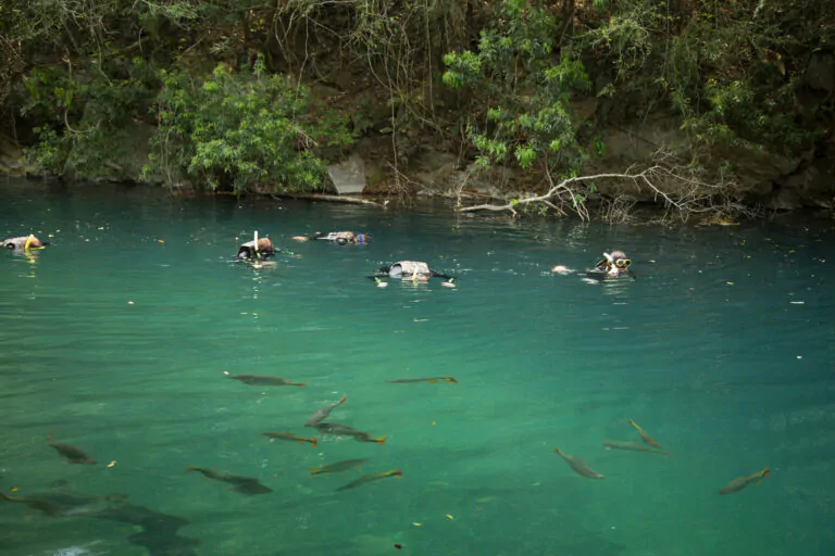 Early departure for snorkeling in the crystal-clear waters of the Olho D’Água River, which flows into the Prata River. The tour begins with a guided walk through primary forest filled with giant peroba, jatobá, and aroeira trees. Then, a calm snorkeling experience begins, inside a natural aquarium teeming with aquatic life. After the activity, enjoy a typical local lunch at the farm’s headquarters. The site is 50 km from Bonito.