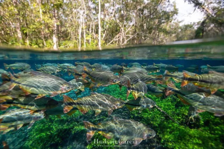 Early morning departure for snorkeling in the crystal-clear blue waters of the Olho D’Água River, which flows into the Rio da Prata. The tour includes a guided interpretive trail through pristine forest filled with century-old trees such as perobas, jatobás, and aroeiras. At the end of the trail, you’ll begin a tranquil float through a vast natural aquarium rich in aquatic life and vegetation. Afterward, enjoy a delicious traditional lunch from Mato Grosso do Sul (included) at the farmhouse. The attraction is located 50 km from Bonito. On the way back, visit Buraco das Araras, a massive sandstone sinkhole 120m deep and 500m wide — a natural habitat for many birds, especially the red macaws.